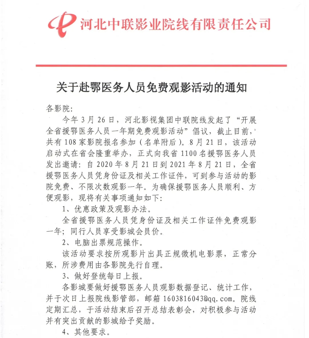 在活動發(fā)布的同時,河北影視集團中聯(lián)院線還專門向參加活動的影城印發(fā)了《關(guān)于赴鄂醫(yī)務(wù)人員免費觀影活動的通知》,要求各影院自2020年8月21日到2021年8月21日,做好援鄂醫(yī)務(wù)人員免費觀影的接待及票務(wù)統(tǒng)計工作。隨著復(fù)業(yè)影城的增加,中聯(lián)院線會有更多影院加入此項活動。