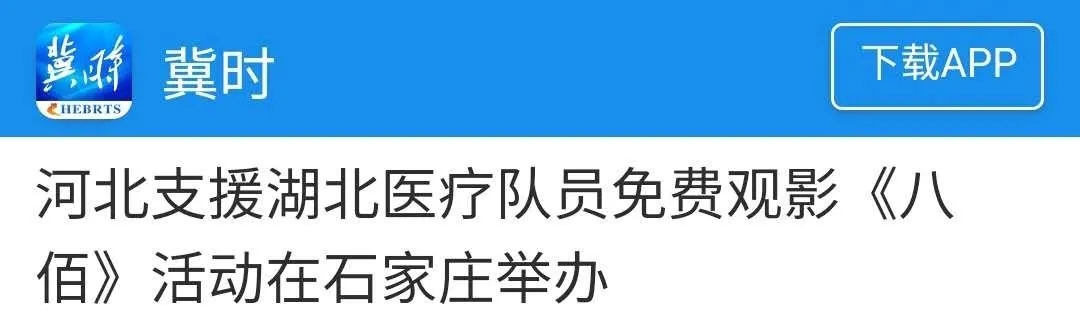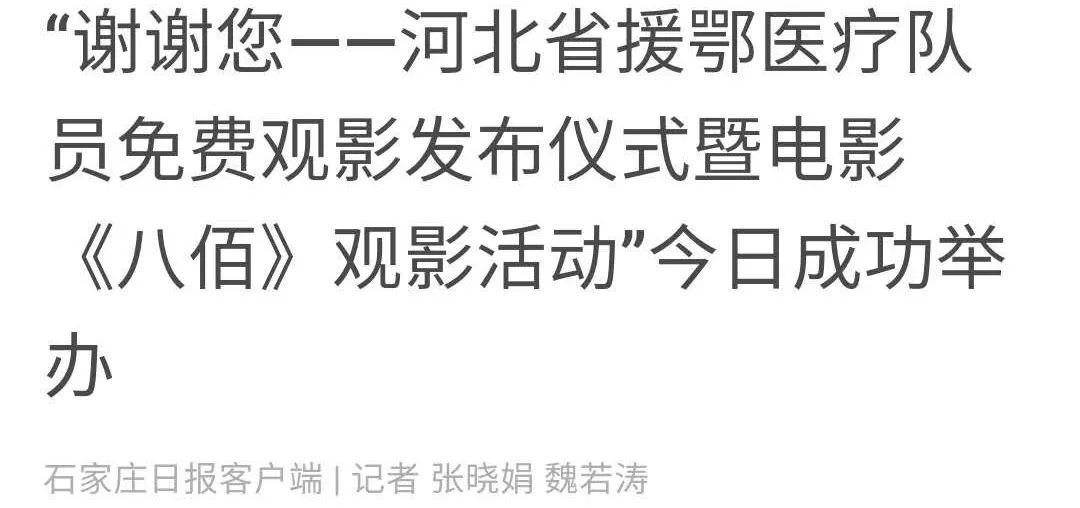 8月21日,在“謝謝您——河北省援鄂醫(yī)療隊(duì)員免費(fèi)觀影發(fā)布儀式暨電影《八佰》觀影活動(dòng)”結(jié)束后,多家媒體對(duì)此次活動(dòng)進(jìn)行了報(bào)道和宣傳。河北廣播電視臺(tái)《河北新聞聯(lián)播》和《今日資訊》第一時(shí)間播出了相關(guān)采訪內(nèi)容。