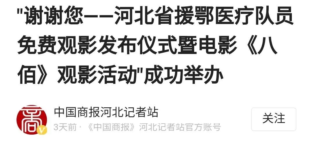 目前,中聯(lián)院線旗下參與活動(dòng)的影院正在按照《河北影視集團(tuán)中聯(lián)影業(yè)院線關(guān)于赴鄂醫(yī)務(wù)人員免費(fèi)觀影活動(dòng)的公告》,全面做好我省援鄂醫(yī)務(wù)人員免費(fèi)觀影服務(wù)。