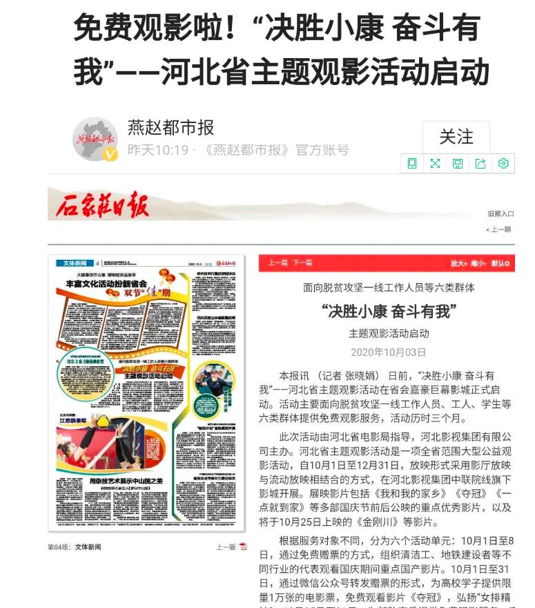 9月30日,在“‘決勝小康 奮斗有我’——河北省主題觀影活動”啟動式結(jié)束后,多家媒體對此次活動進行了報道和宣傳。河北廣播電視臺《河北新聞聯(lián)播》和《今日資訊》第一時間播出了相關(guān)采訪內(nèi)容。