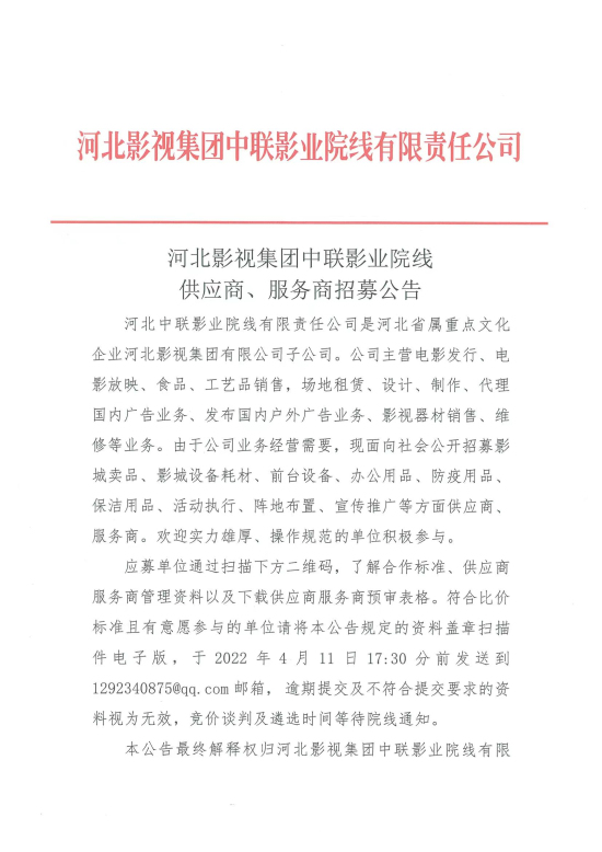 河北影視集團(tuán)中聯(lián)影業(yè)院線供應(yīng)商、服務(wù)商招募公告