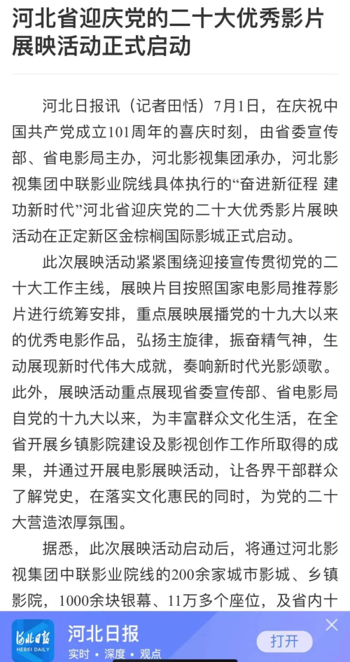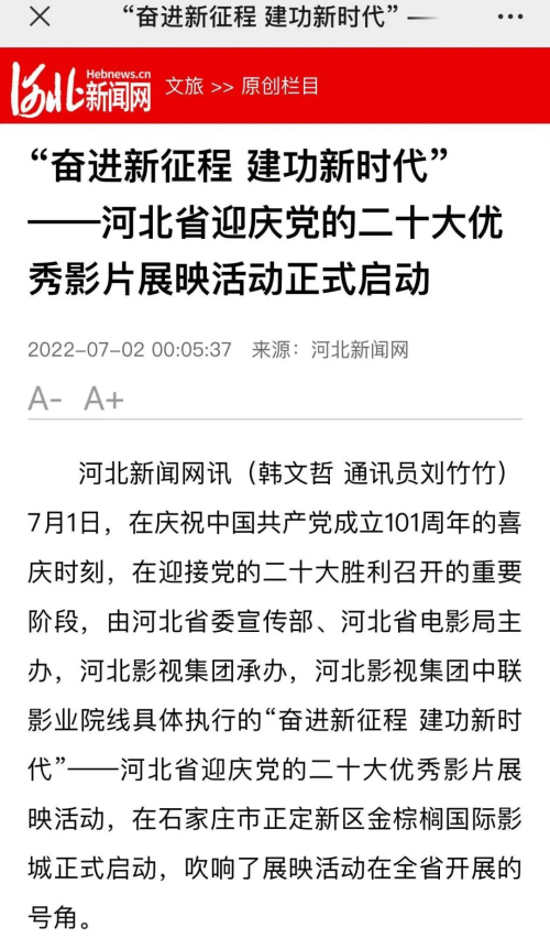 7月1日,“奮進(jìn)新征程 建功新時代”——河北省迎慶黨的二十大優(yōu)秀影片展映活動在石家莊市正定新區(qū)金棕櫚國際影城正式啟動后,多家中央級、省級媒體對活動進(jìn)行了宣傳報道。CCTV6中國電影報道、河北廣播電視臺河北新聞聯(lián)播、今日資訊、新聞6號線等媒體第一時間播出了活動相關(guān)采訪視頻內(nèi)容。