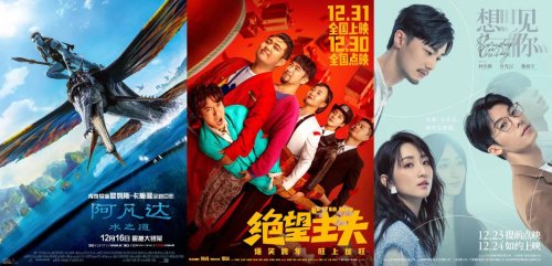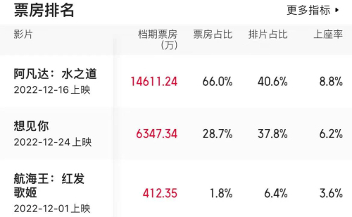 12月初,隨著全國(guó)疫情防控形勢(shì)變化,電影票房逐步回升。據(jù)貓眼專業(yè)版數(shù)據(jù)顯示,《阿凡達(dá):水之道》《想見(jiàn)你》《航海王:紅發(fā)歌姬》位居圣誕檔期票房前三位。