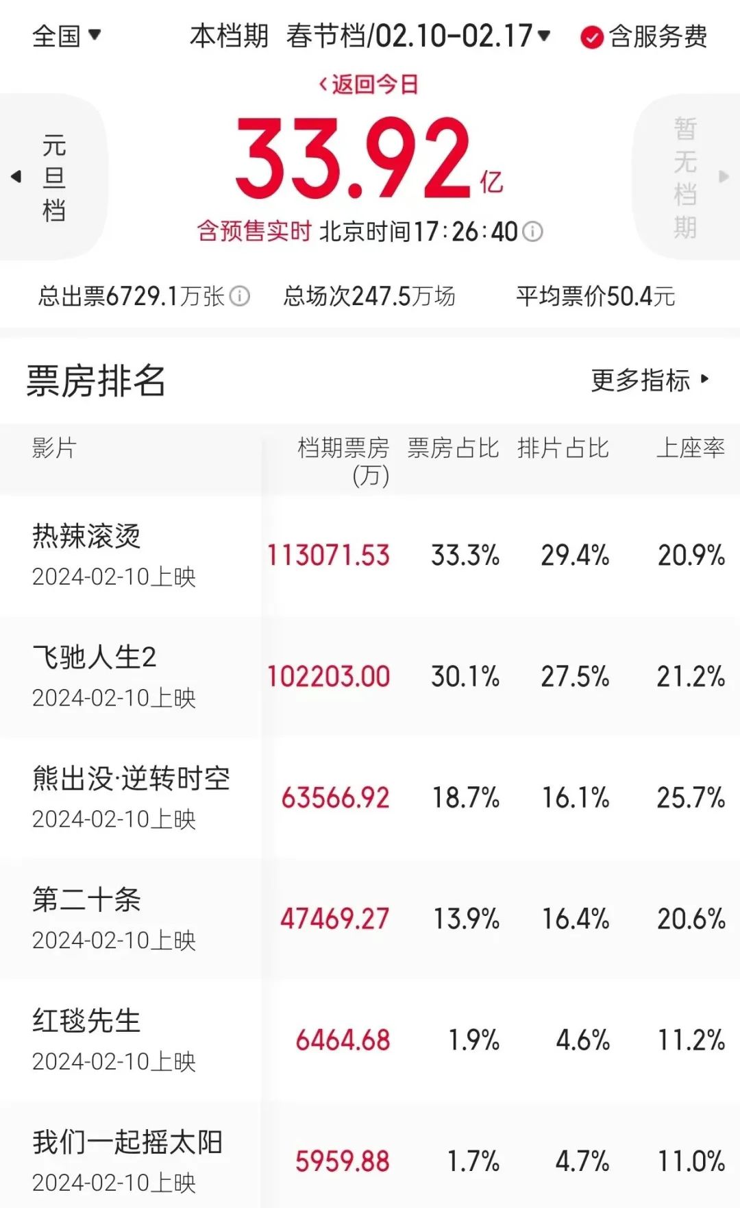 據(jù)貓眼專業(yè)版數(shù)據(jù)顯示,截止目前,2024春節(jié)檔票房已突破33.92億元,累計(jì)觀影人次超6729萬人,總場次達(dá)247.5萬場,電影市場迎來了開門紅。其中,影片《熱辣滾燙》、《飛馳人生2》、《熊出沒·逆轉(zhuǎn)時(shí)空》分別以11.3億元、10.2億元、6.3億元的票房成績暫列票房榜前三名。檔期票房超4.7億元的影片《第二十條》緊隨其后,影片《紅毯先生》和《我們一起搖太陽》也分別獲得了超6400萬元和5900萬元的票房。