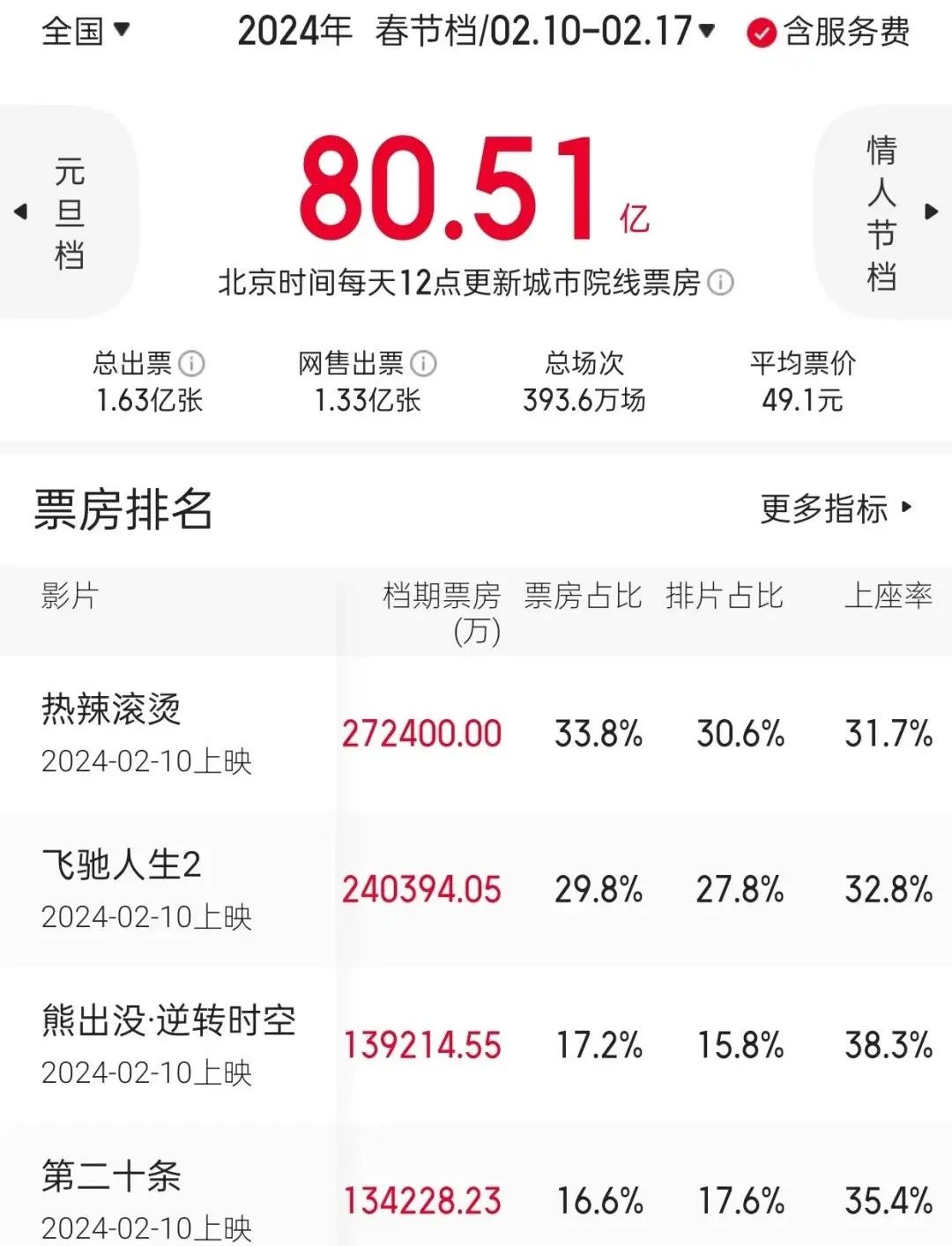 據(jù)貓眼專(zhuān)業(yè)版數(shù)據(jù)顯示,2024年春節(jié)檔全國(guó)電影總票房突破80.51億元、總?cè)舜纬^(guò)1.63億人,檔期票房、觀影人次雙雙刷新紀(jì)錄。