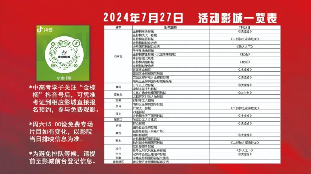 省內(nèi)外中高考應(yīng)屆畢業(yè)生可持本人準(zhǔn)考證到活動影院前臺登記信息報名預(yù)約進(jìn)行觀影,或關(guān)注“金棕櫚”官方抖音號,私信上傳本人準(zhǔn)考證照片、手機(jī)號信息,進(jìn)行預(yù)約,選擇在任意一家參與活動的影城免費(fèi)觀影。