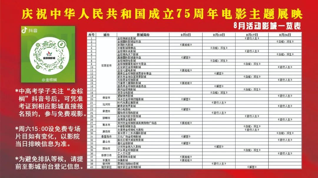 8月,活動(dòng)將在河北影視集團(tuán)中聯(lián)院線旗下40家影城開展,每周六下午15:00在不同影城開設(shè)免費(fèi)電影專享場(chǎng)次,重點(diǎn)放映《抓娃娃》《解密》《逆行人生》《白蛇:浮生》等熱門影片,歡迎廣大學(xué)子積極參與。