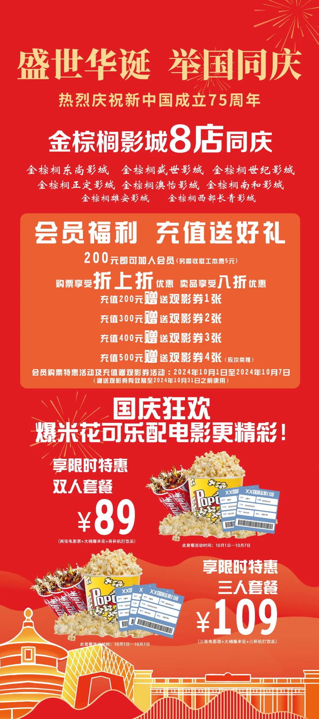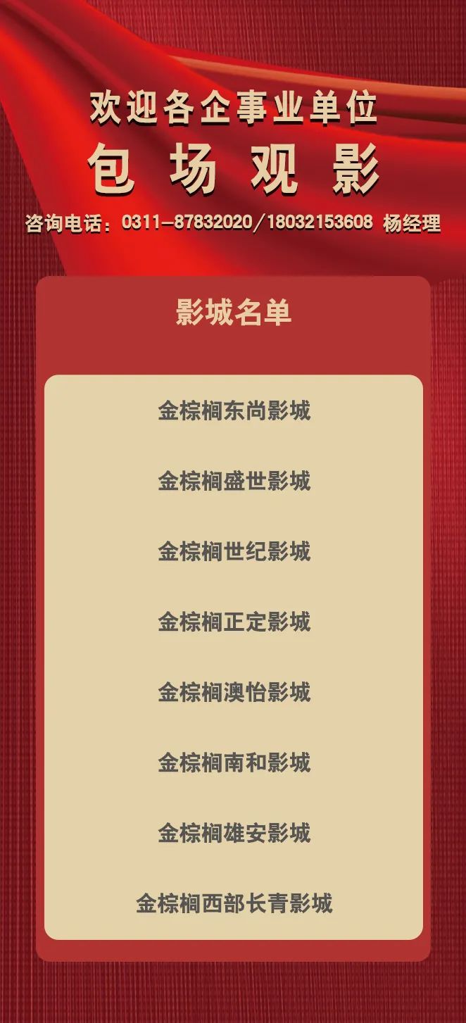 喜迎國(guó)慶,禮贊祖國(guó)。河北影視集團(tuán)特別推出金棕櫚影城國(guó)慶節(jié)系列特惠活動(dòng),金棕櫚東尚影城、金棕櫚盛世影城、金棕櫚世紀(jì)影城、金棕櫚正定影城、金棕櫚澳怡影城、金棕櫚南和影城、金棕櫚雄安影城、金棕櫚西部長(zhǎng)青影城八店同慶盛世華誕!